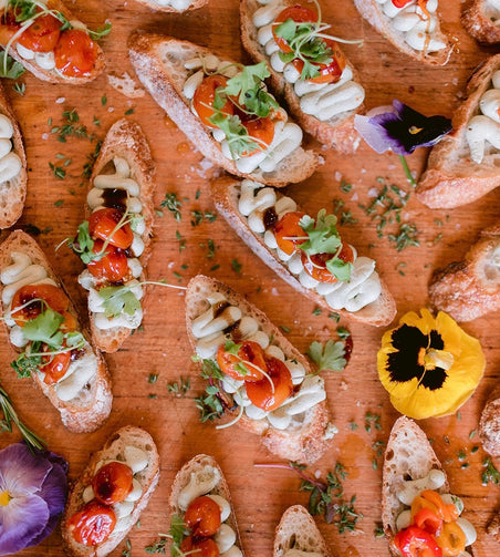 Toasted sourdough bread topped with whipped pumpkin seed ricotta and inspired, seasonal toppings.